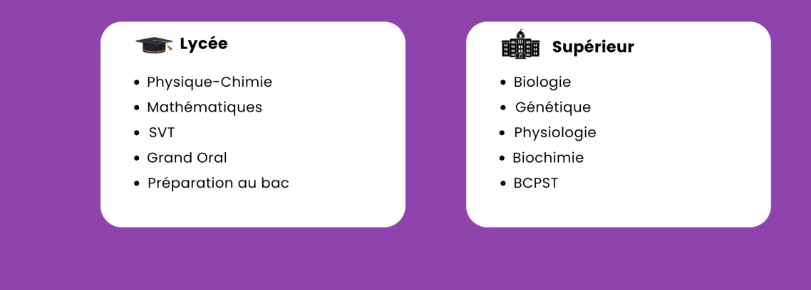 J’accompagne les collégiens, lycéens et étudiants du supérieur dans leurs apprentissages en sciences, avec une attention particulière à la méthodologie et à la confiance en soi.